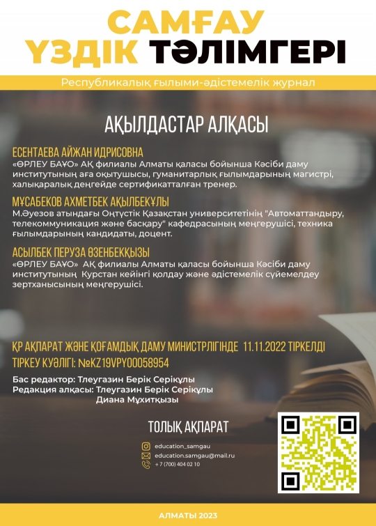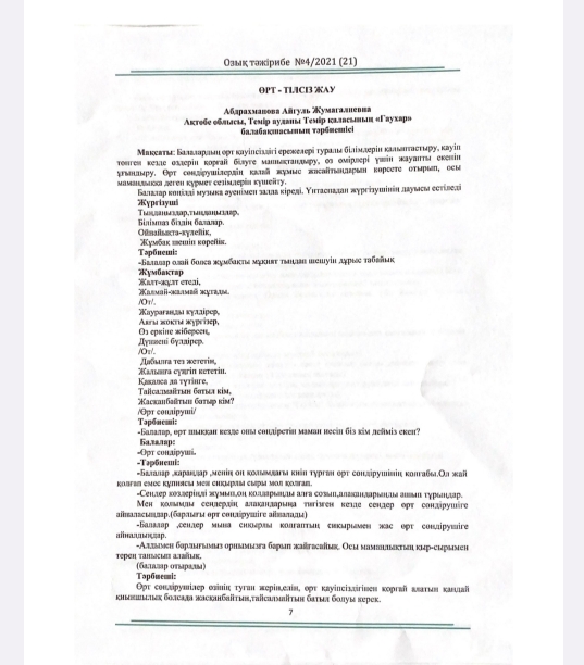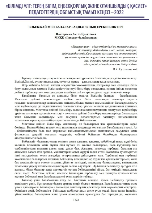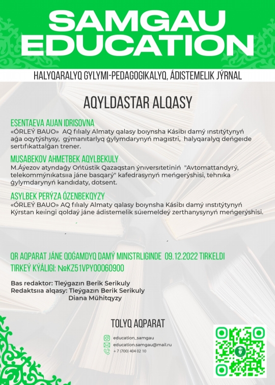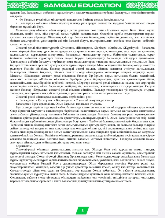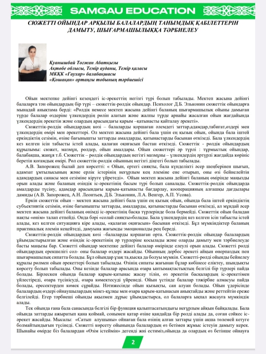 Сөжетті ойындар арқылы балалардың танымдық қабілеттерін дамыту шығармашылыққа тәрбиелеу мақсатында «Қошақан» ортанғы тобының тәрбиешісі Қуанышбай Тоғжан «Samgau Education» атты журналына мақала жариялады