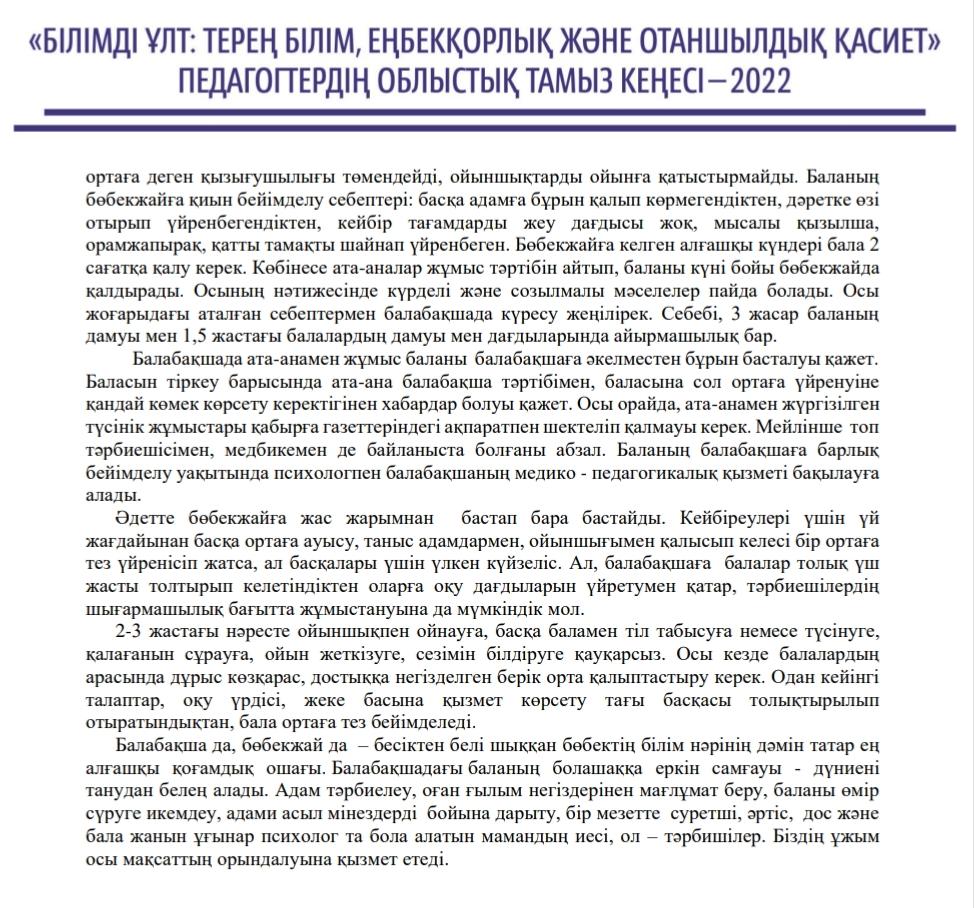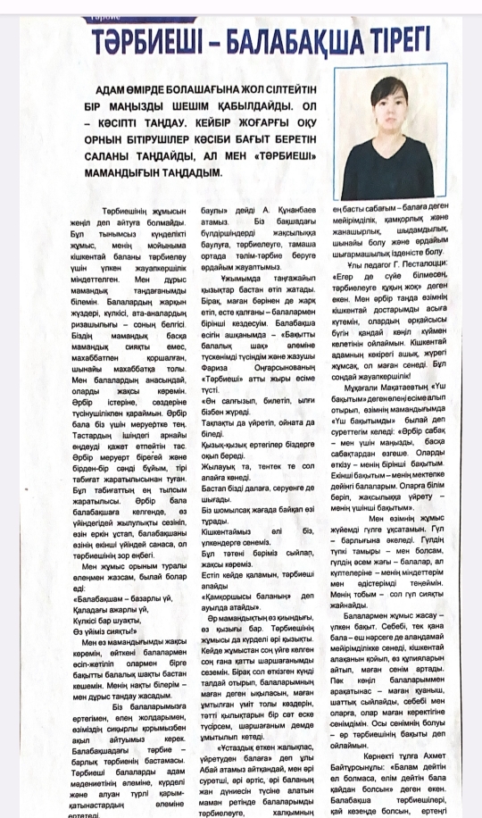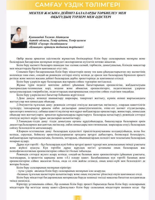 Мектеп жасына дейінгі балаларды тәрбиелеу мен оқытудың түрлері және әдістерімен бөлісу мақсатында «Қошақан» ортаңғы тобының тәрбиешісі Қуанышбай Тоғжан «Самғау үздік тәлімгері» атты журналына мақала жариялады